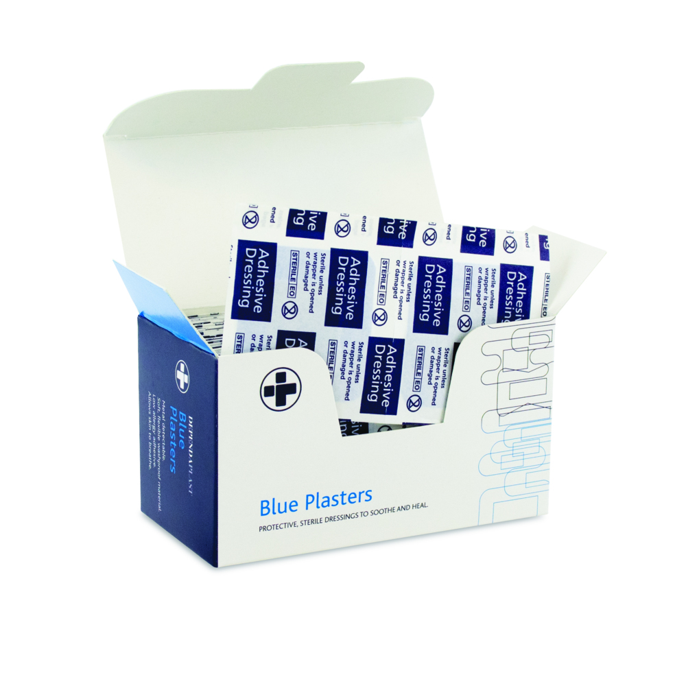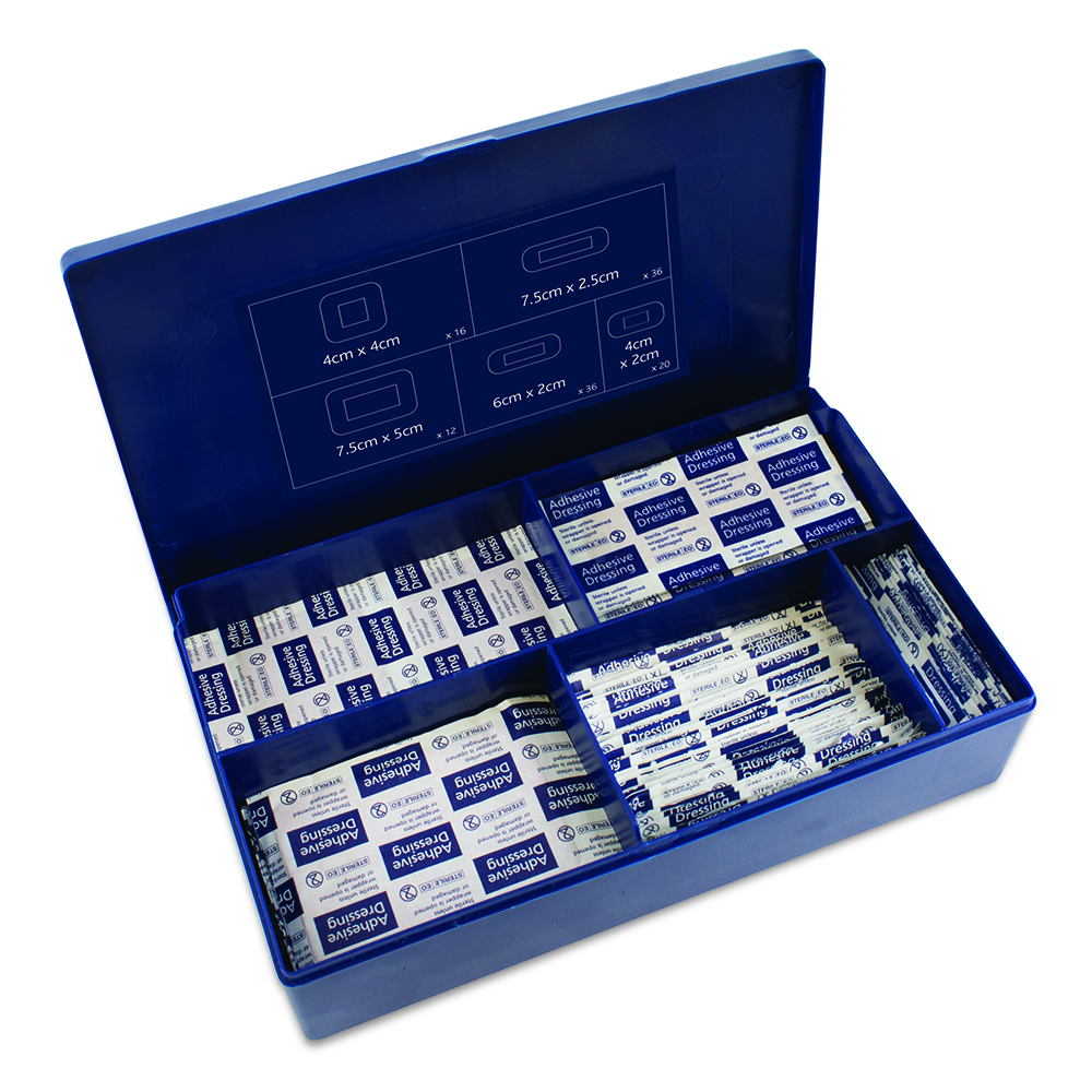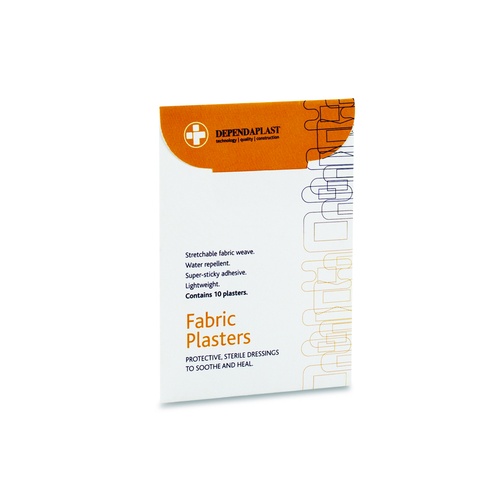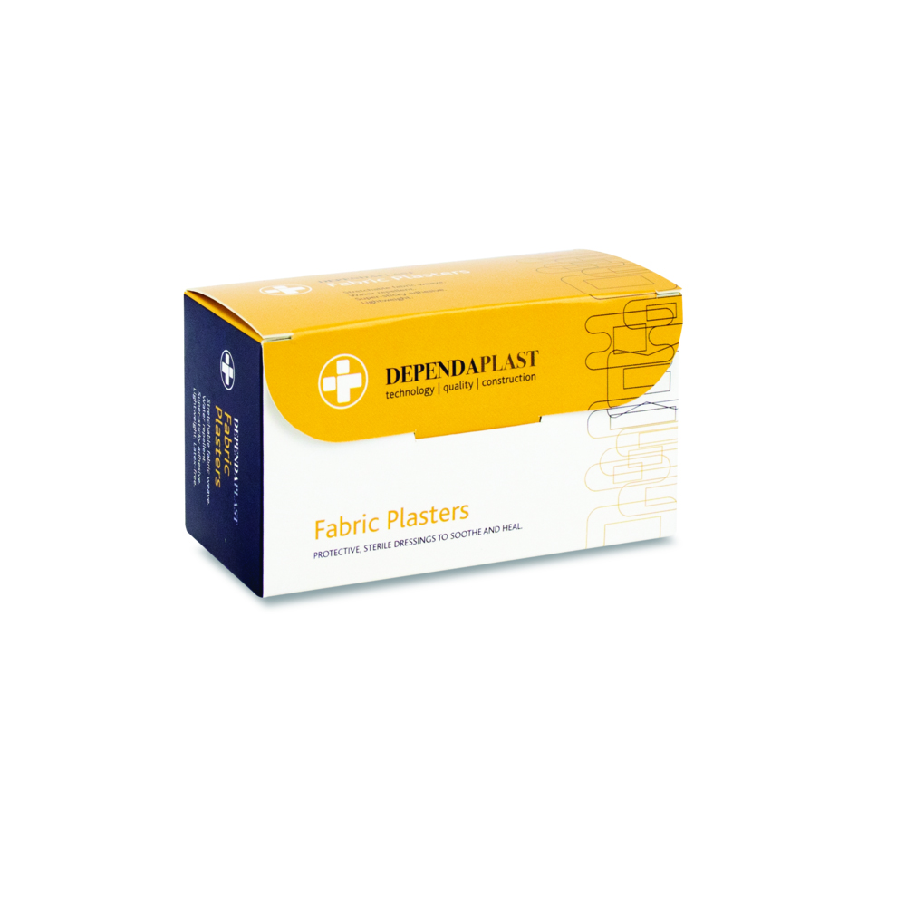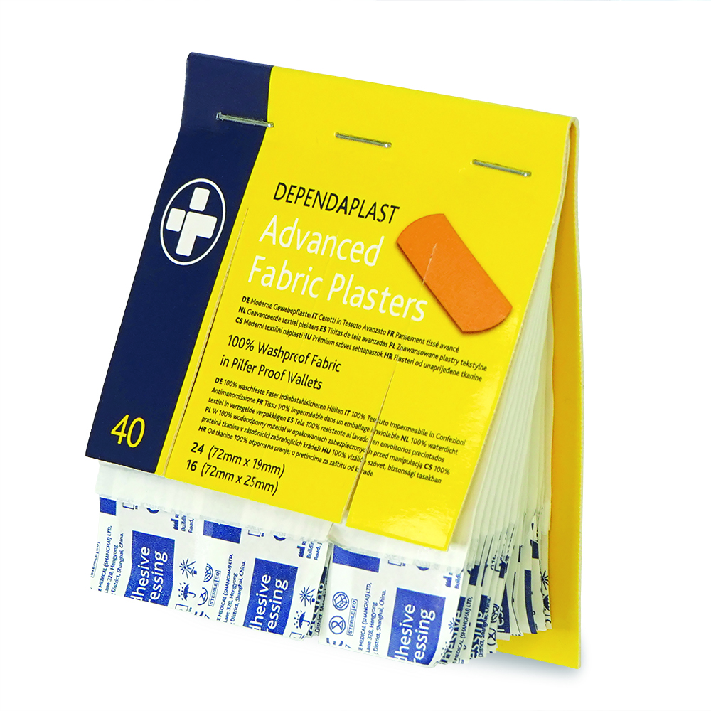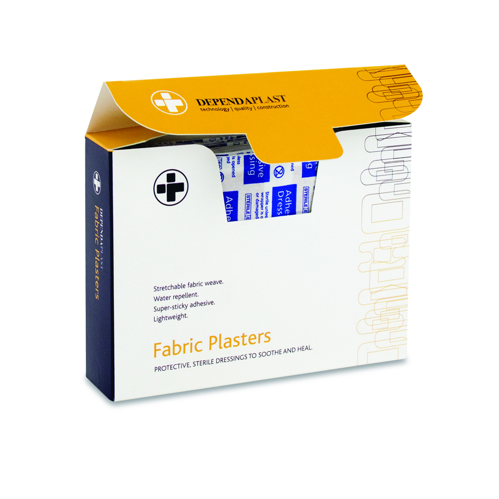 - 120 fabric sterile plasters in a robust plastic box dispenser.