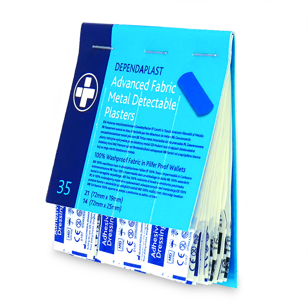 Dependaplast – Advanced Metal Detactable 100% Washproof Fabric Plasters – Assorted – Blue – Pilfer Proof Wallet of 35 – BOX OF 5