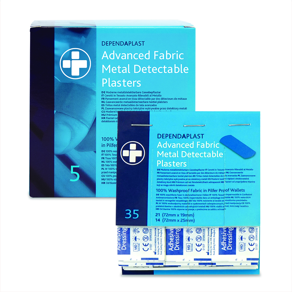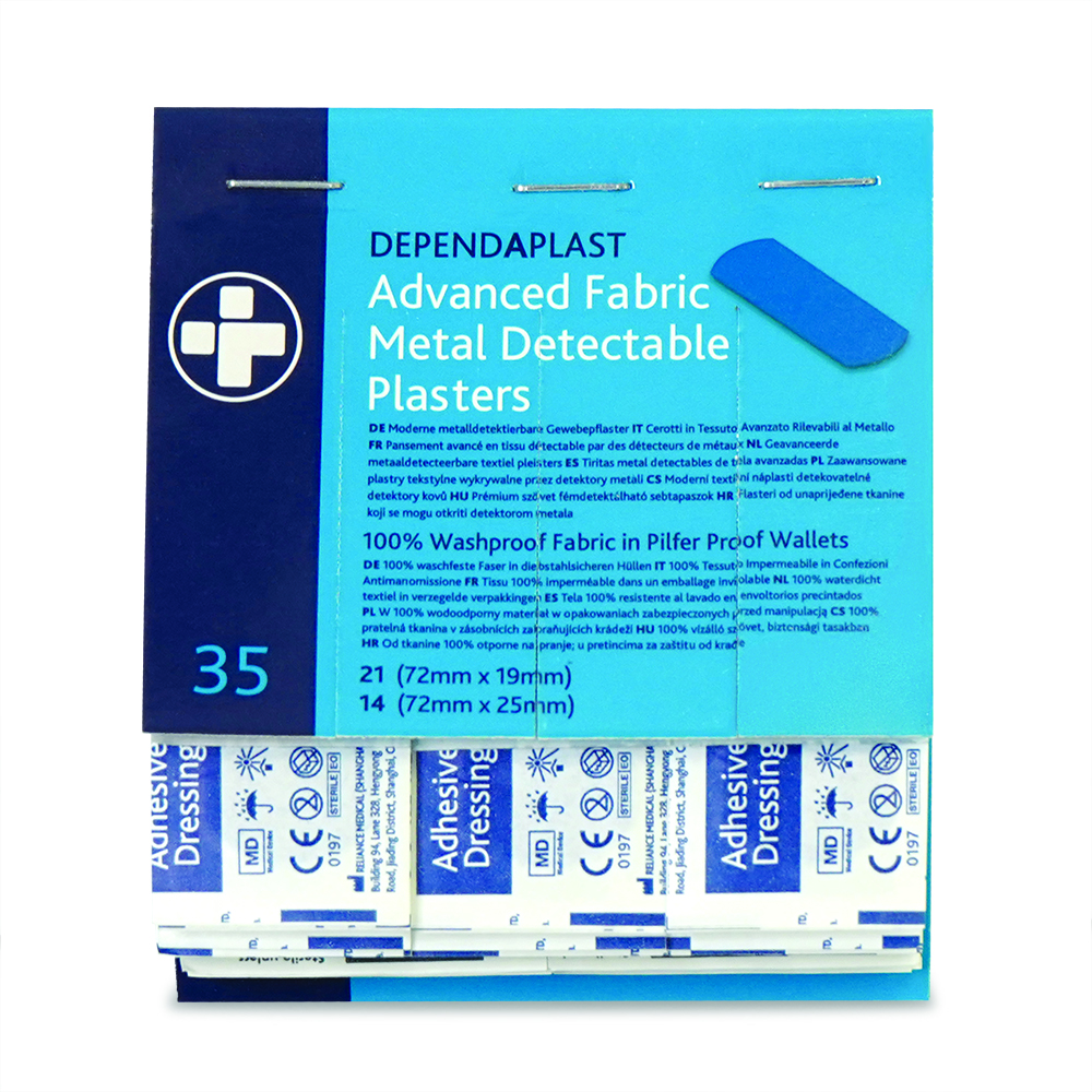 Dependaplast – Advanced Metal Detactable 100% Washproof Fabric Plasters – Assorted – Blue – Pilfer Proof Wallet of 35 – BOX OF 5