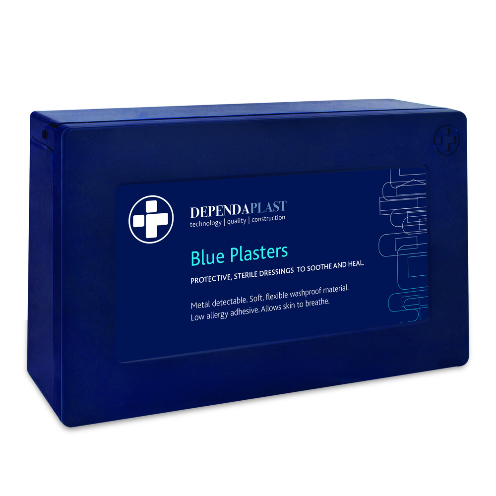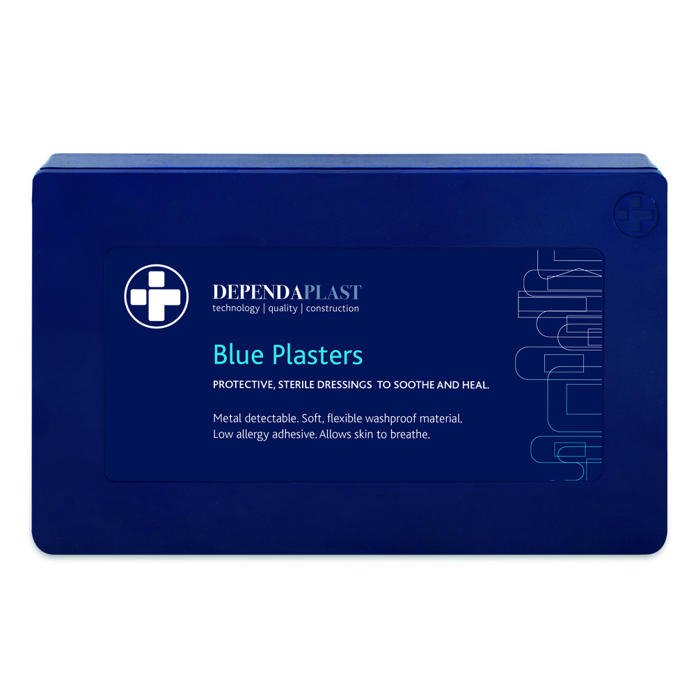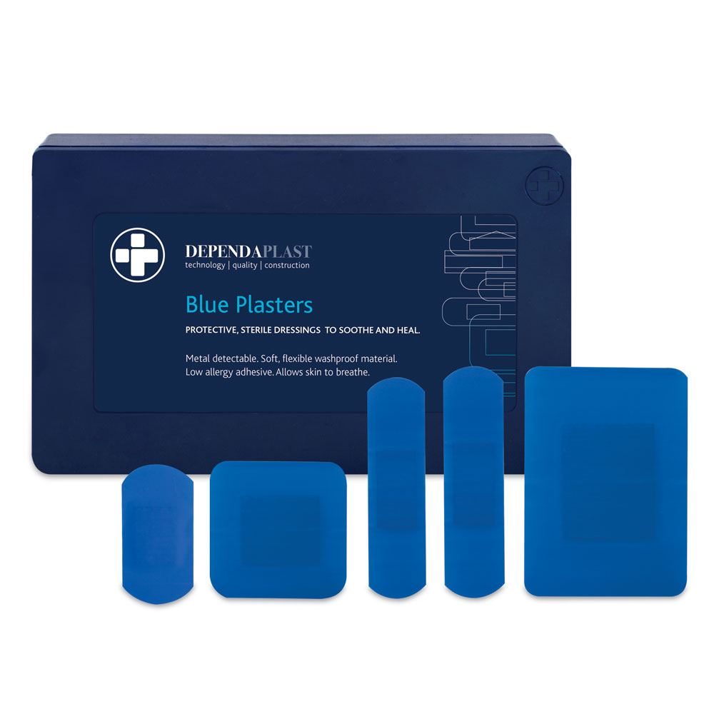 Dependaplast Blue plasters packed into a smart, compact box, suitable for any surgery, office, or home worktop. The selection in the box is perfect for everyday incidents. Providing quick and clear access to five plaster sizes, each size is neatly stored in its own section. Labelling also clearly indicates the position of each sized plaster in the box, for ease of use.