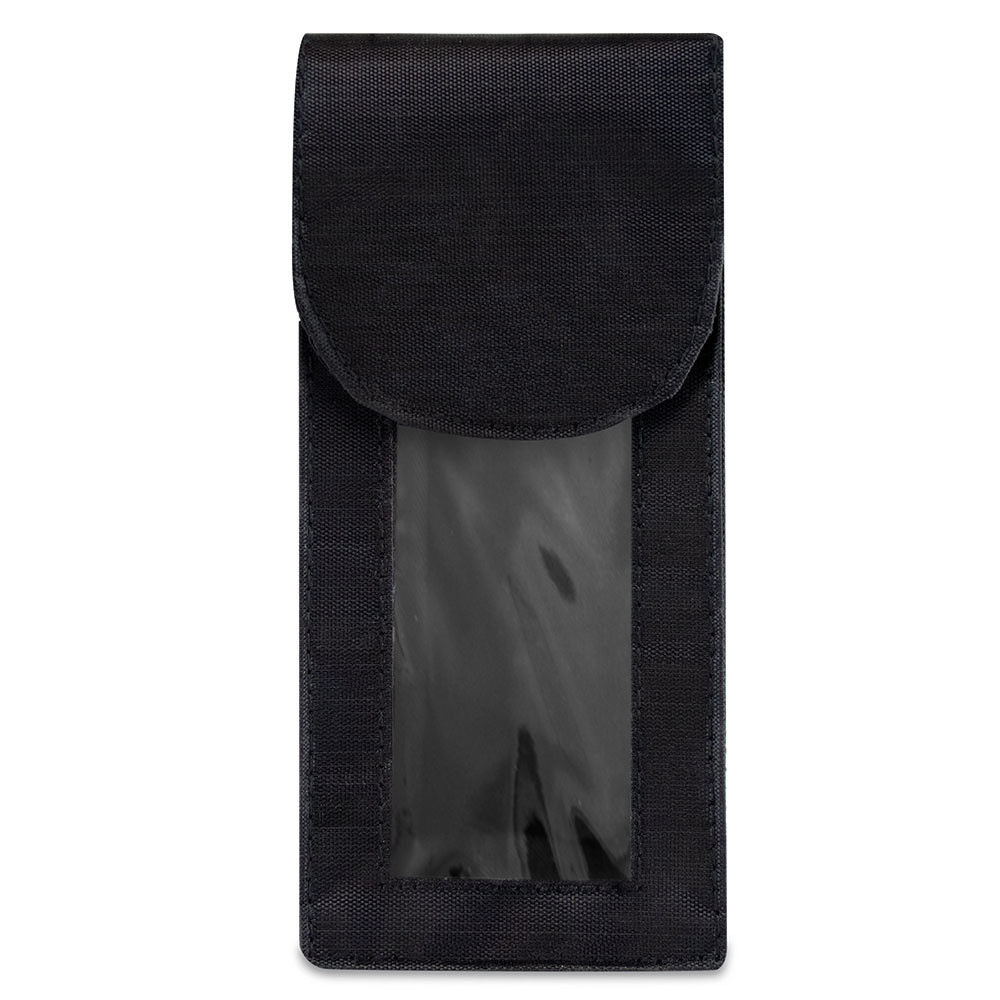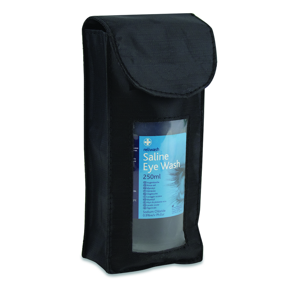Black vinyl belt pouch, complete with belt strap for carrying Reliwash 250ml bottle, as a personal issue in high risk environments. Also suitable for similar personal issue items such as alcohol hand gels.