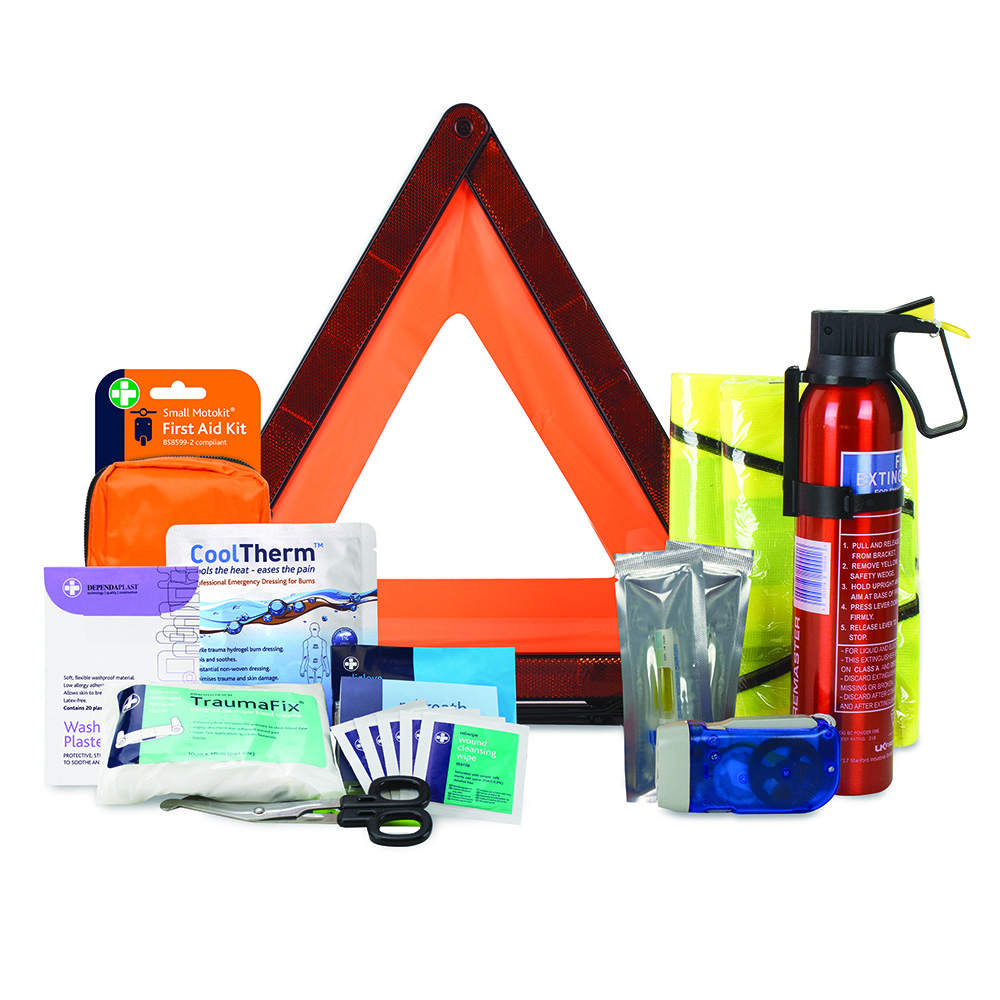 An essential for the discerning driver wanting to be prepared for any roadside incident. Contains many essential items required to keep you safe while on the side of the road. Collapsible warning triangle and high visibility vests make other road users aware in the event of a breakdown. The first aid kit and fire extinguisher are specifically designed for vehicle use. The kit contains many other items that are invaluable for both driving safety and roadside emergencies.
