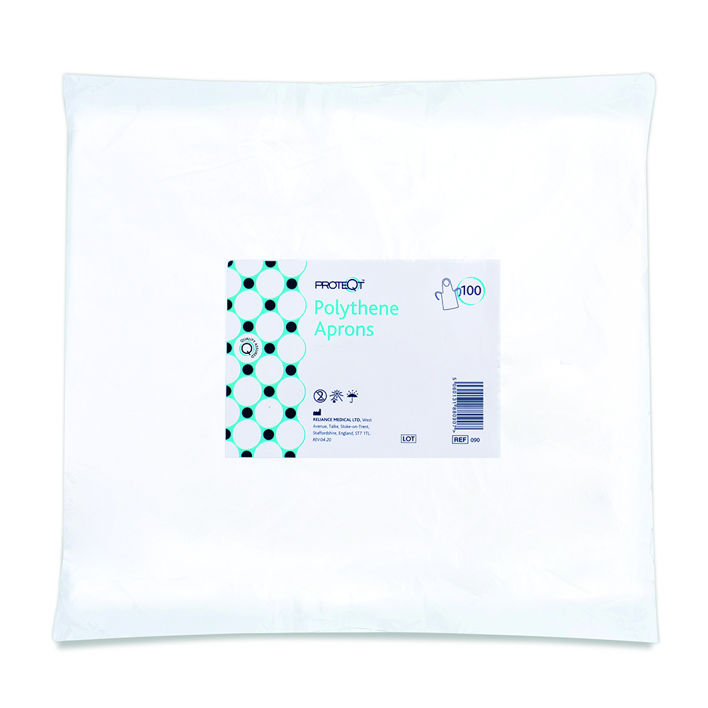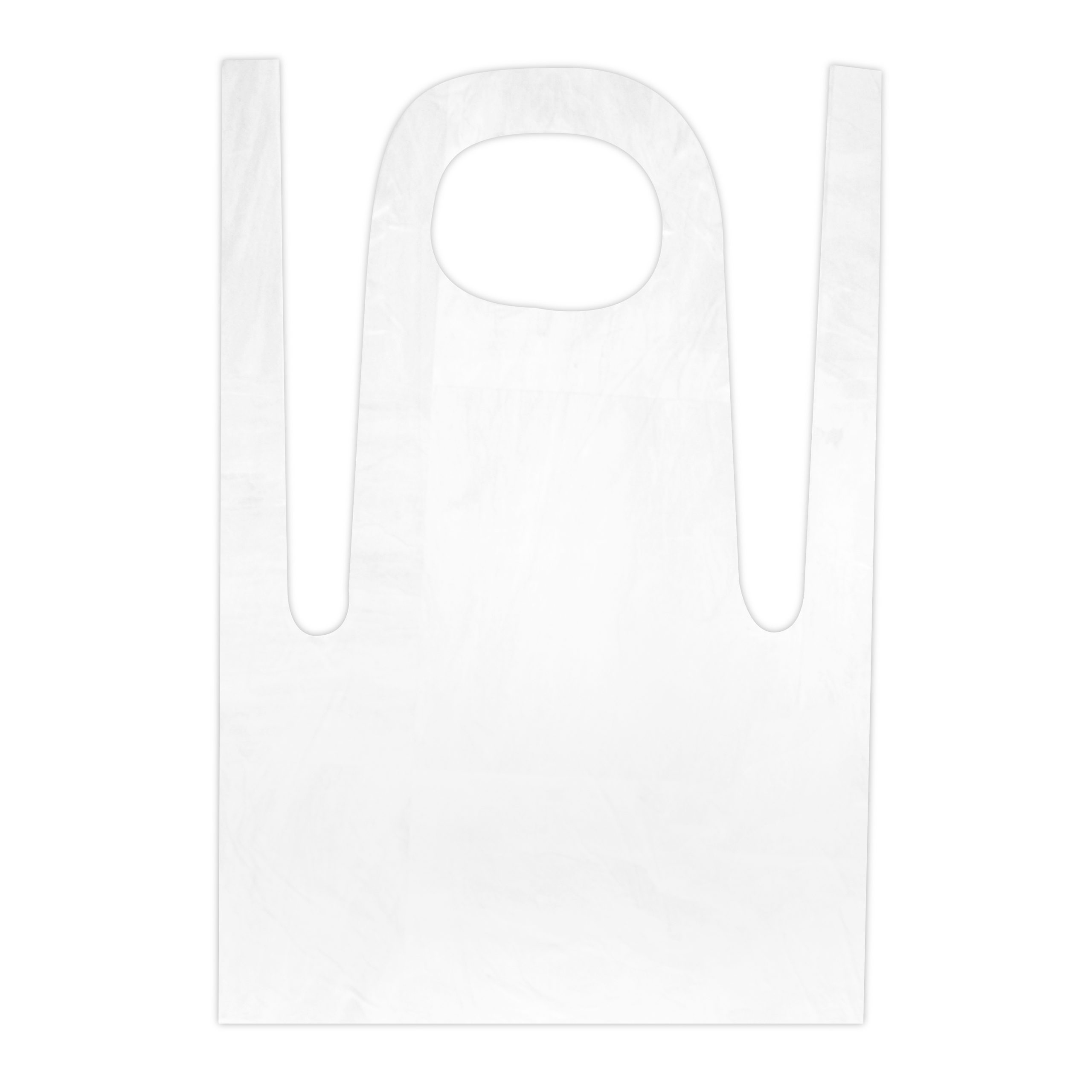 Disposable polythene aprons, with halter neck and waist ties. Material is resistant to fluid and bacterial penetration.