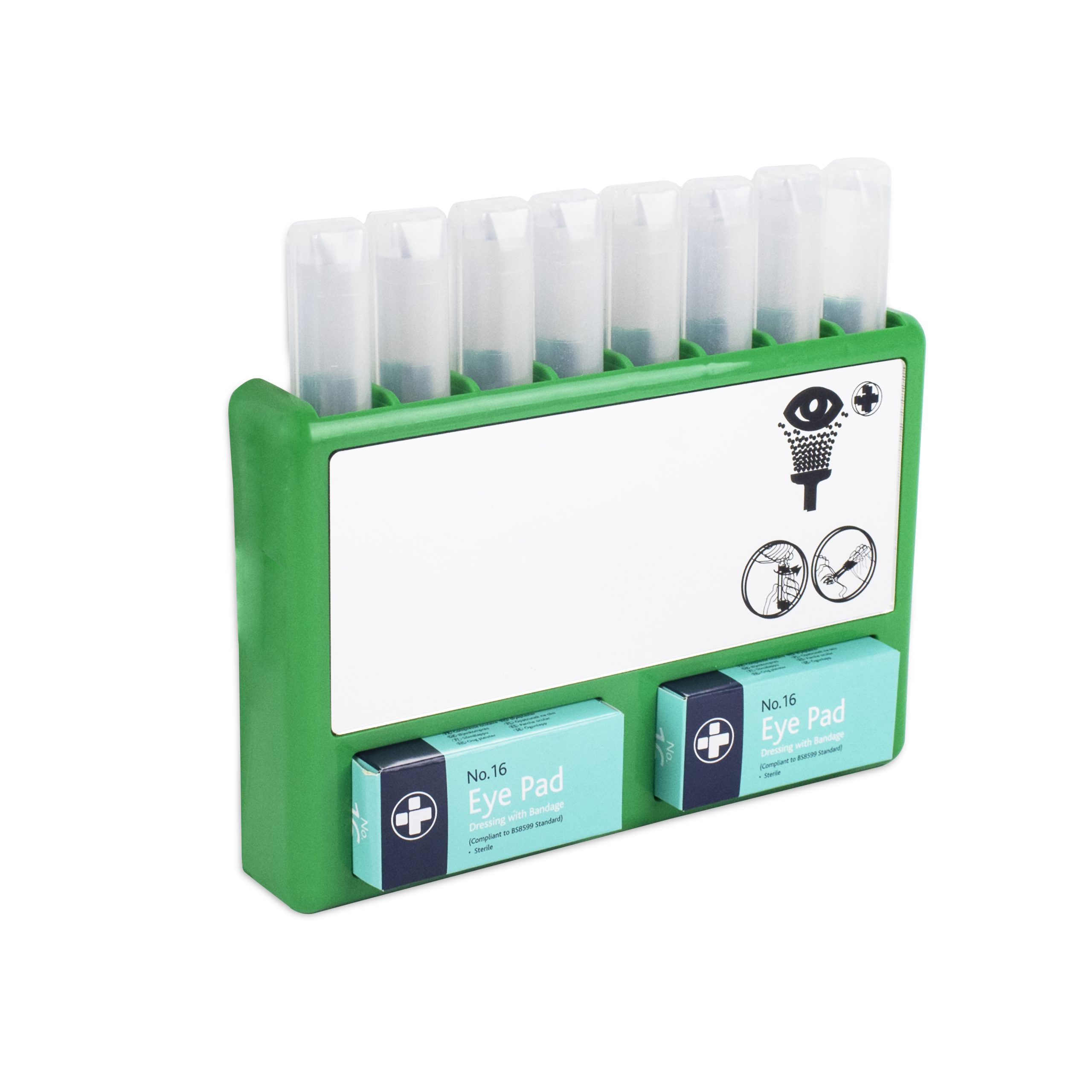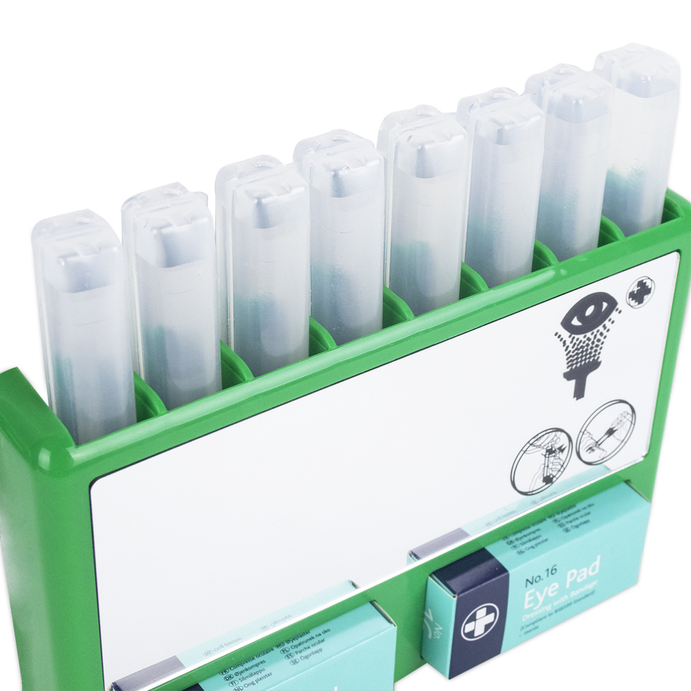 Finished in a high visibility green for easy location in a critical situation, the complete station includes eight 20ml sterile saline pods and two eye pad dressings, to provide fast and effective relief to minor injuries. A complete and an empty option are available.
