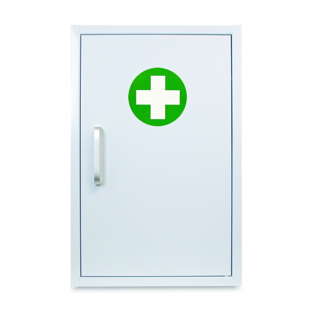 End storage problems in First Aid rooms and similar environments with this strong enamelled metal wall cabinet. The cabinet is non-locking – secured by a metal handle and magnetic closures. This cabinet will provide a safe and secure home for emergency or back-up first aid products. Finished in a hard-stove and clinical white enamel, not only does this cabinet look smart, but also offers security, protection. Supplied with ‘First Aid Cross’ stickers. *Note: not intended or suitable for the storage of pharmaceuticals.