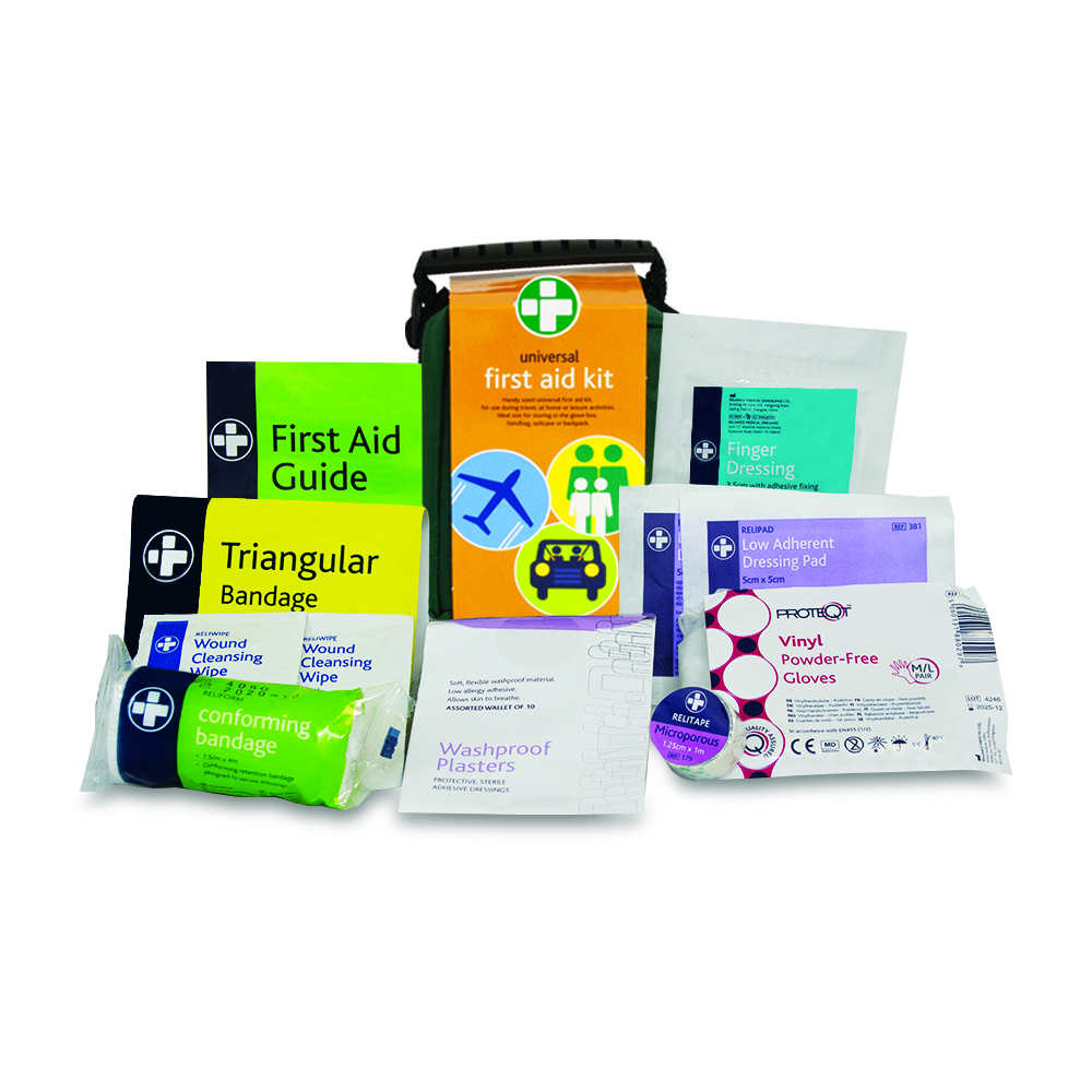 Handy sized universal first aid kit, designed for use during travel, at home or leisure activities. Ideal size for storing in the glove box, handbag, suitcase or backpack.