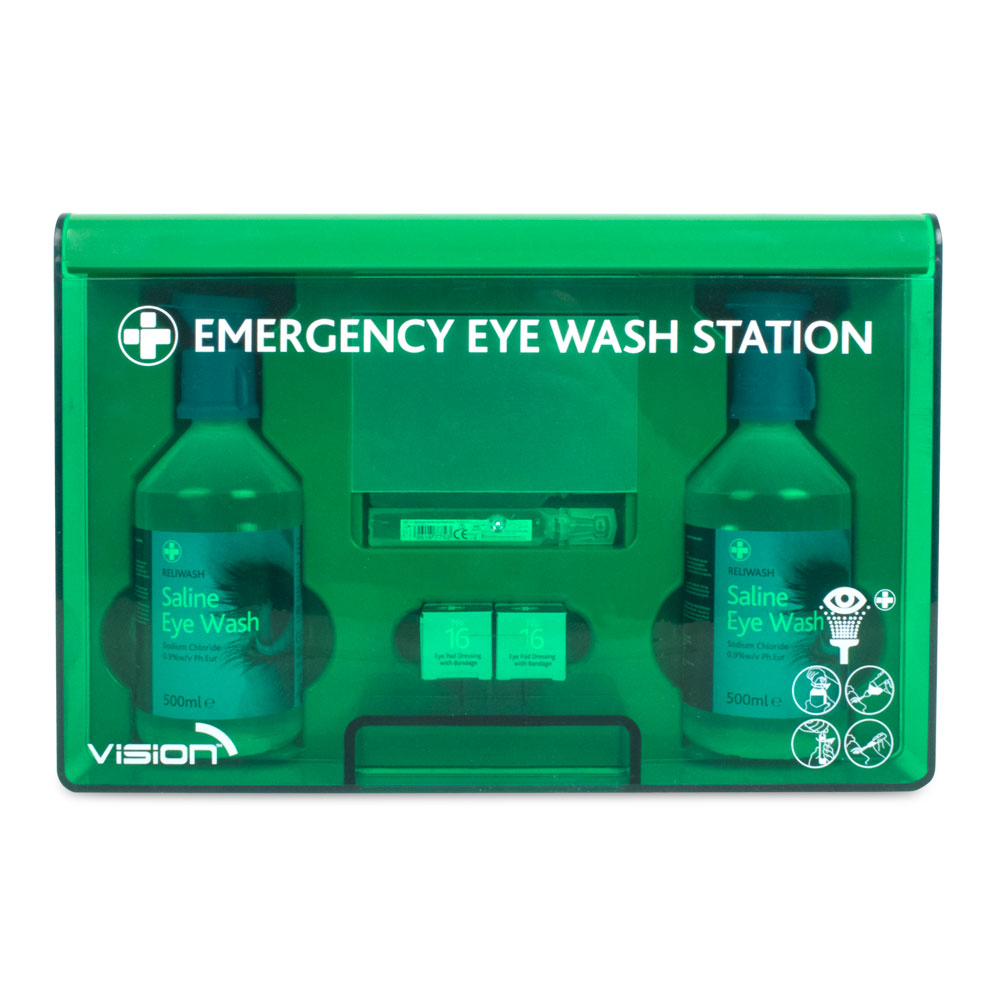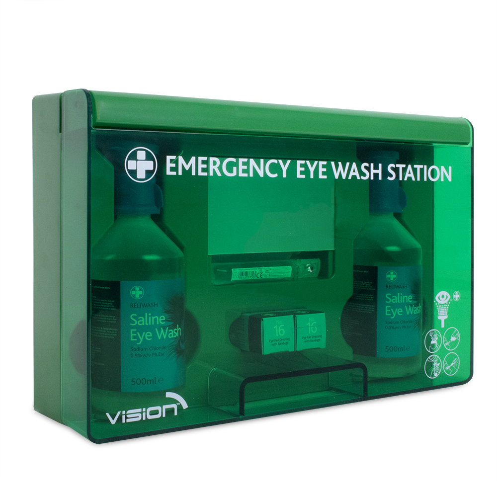 Wipeable, hard-wearing ABS plastic with illuminated printed instructions; useful if a power cut happens so the station can be located. Dust proof heavy duty cover keeps contents clean. Central Mirror for easy application. Contains easy-to-squeeze bottle with an eye cap, allowing the eye to be irrigated easily and efficiently.